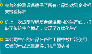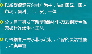 公司是一家瞄準(zhǔn)國際、國內(nèi)市場,集科、工、貿(mào)于一體的綜合性公司,擁有各類先進(jìn)的設(shè)備100余臺(套),公司自主研發(fā)了新型保溫材料及彩鋼復(fù)合保溫板材連續(xù)生產(chǎn)工藝,建成了機(jī)上一次成型彩鋼復(fù)合保溫板材的生產(chǎn)線...